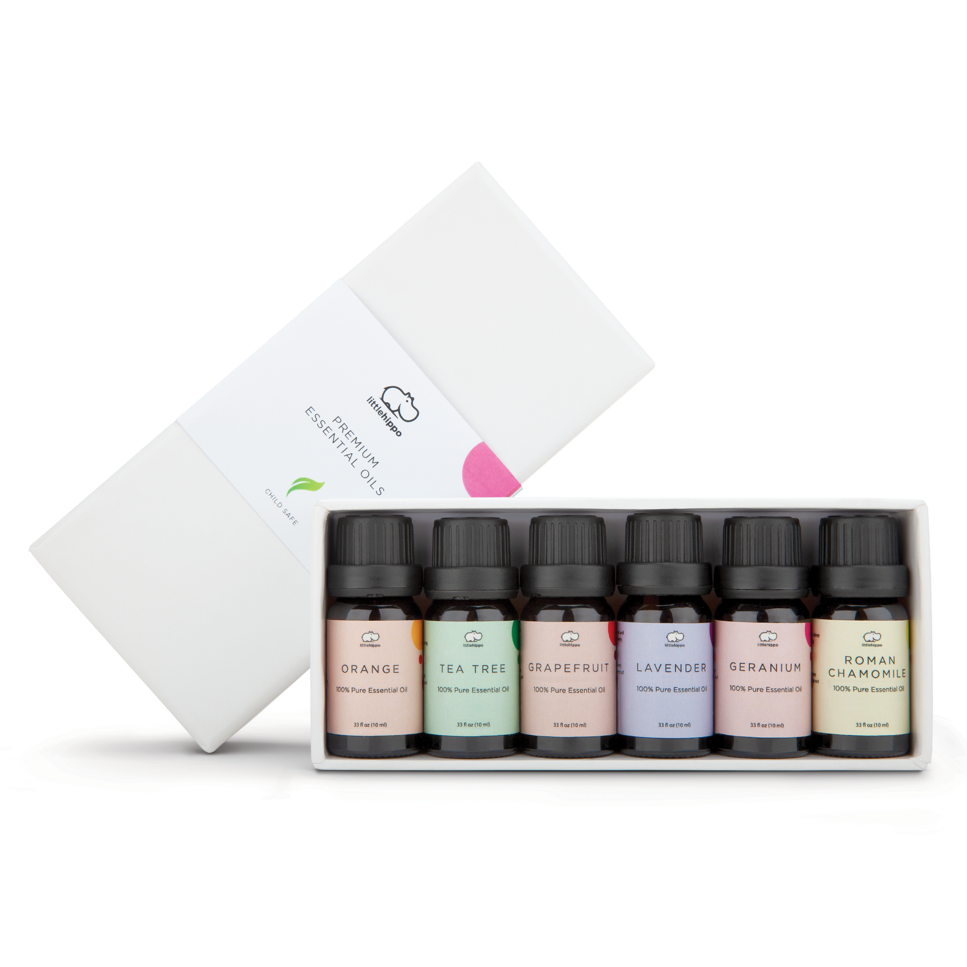 - Six 10 mL bottles: lavender, tea tree, orange, grapefruit, geranium, and roman chamomile