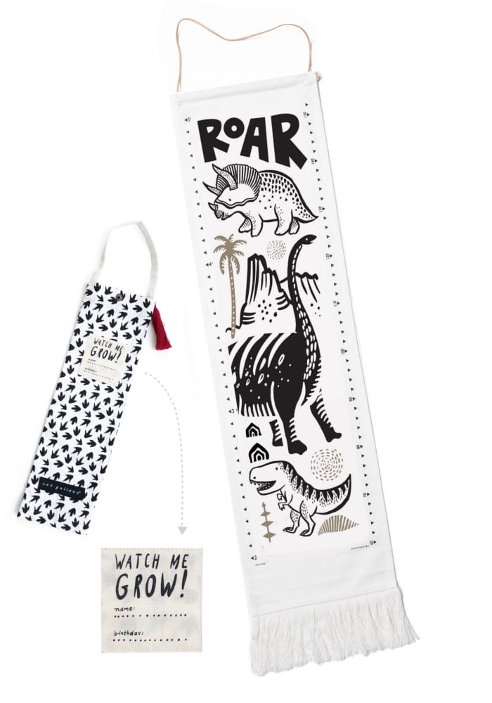 Canvas Growth Chart - Dinos is a gentle, story-driven wall tapestry that marks childhood milestones with smiling triceratops, brachiosaurus, and t-rex illustrations. Made from 100% organic cotton canvas with a wooden rod, waxed cotton twine, and a soft fringe, it feels tactile and warm while bringing a playful, timeless accent to nursery, bedroom, or play room walls.