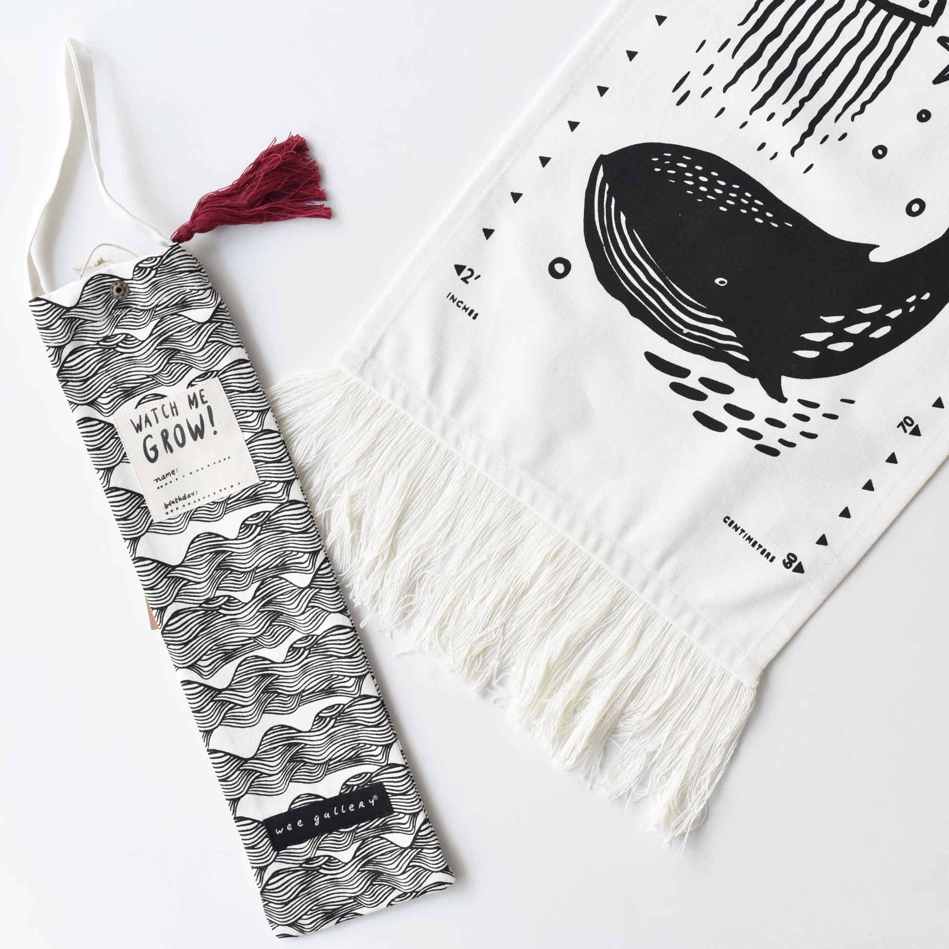 A soft, story-filled growth chart printed on 100% organic cotton canvas, the Ocean design features smiling whales, seahorses, octopus, jellyfish, sea turtle, and fish that grow alongside your child. Ethically screen printed in India and finished with a wooden rod, waxed cotton twine, and fringe, it hangs easily as a keepsake tapestry for nurseries, bedrooms, or play rooms.