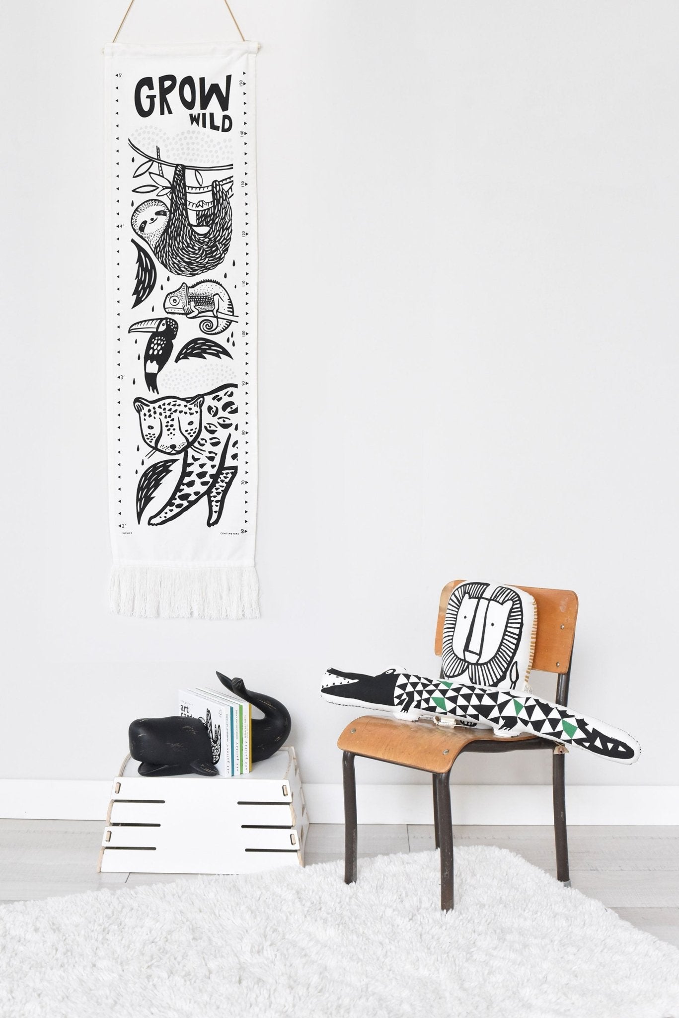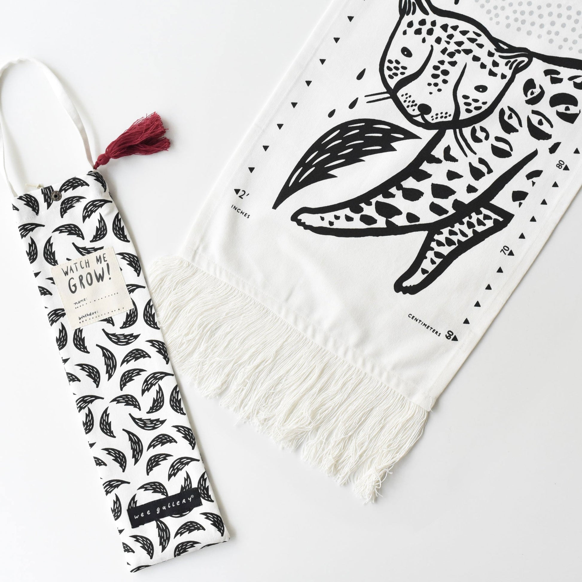 This Rainforest Canvas Growth Chart is a handcrafted wall tapestry that marks childhood moments with gentle, joyful illustrations of a sloth, jaguar, toucan, and chameleon. Made from 100% organic cotton canvas with a wooden rod and waxed cotton twine, it brings a soft, natural texture to nurseries and play rooms while tracking growth in both inches and centimeters.