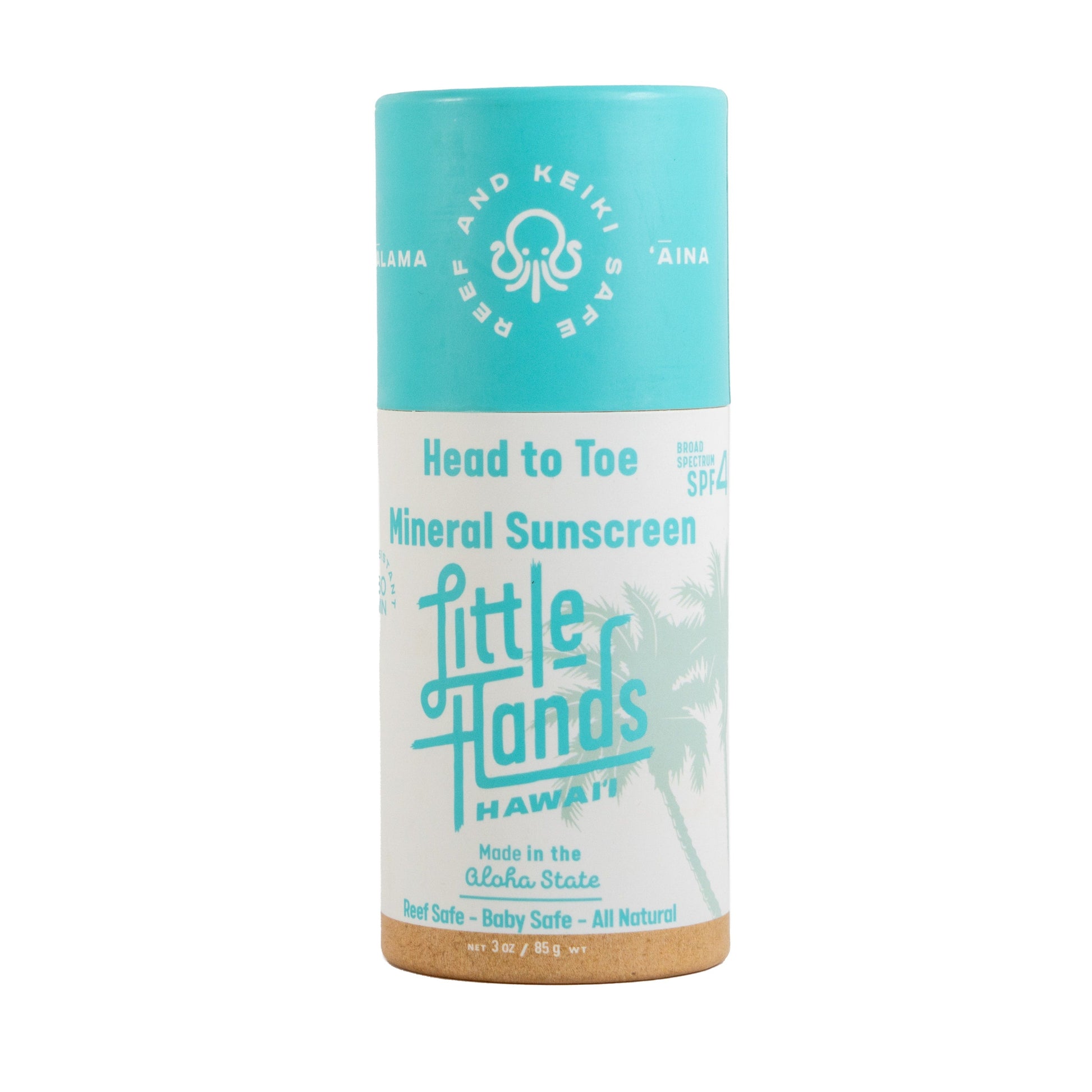 Protect your whole family with the Mineral Sunscreen Head-to-Toe Stick SPF 40+. This creamy, easy-glide stick provides all-over coverage with a formula that’s a perfect blend of Little Hands Hawaii’s ultra-creamy tin and sporty face stick. At 3oz, it lasts a long time, is water resistant up to 80 minutes, and is safe for all ages—including during pregnancy. Packaged in a biodegradable, earth-friendly push-up stick, it’s reef-safe, gentle, and effective sun care you can feel good about.
