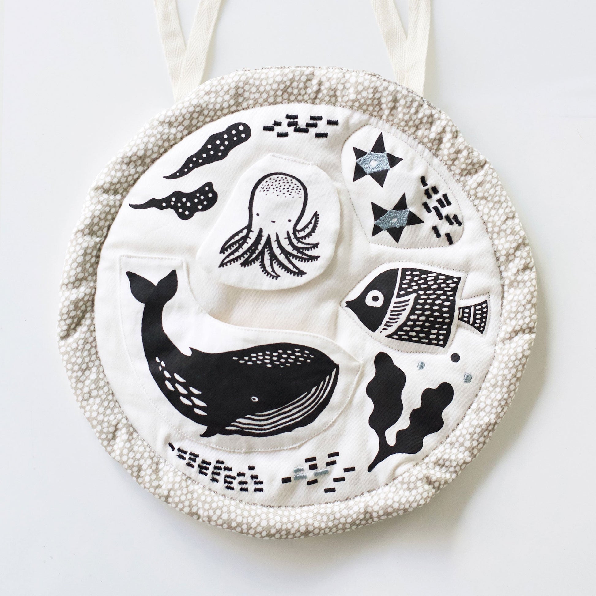The Organic Activity Pad – Ocean is a soft, story-filled sensory mat that turns tummy time into a moment of discovery. Handcrafted from buttery 100% organic cotton canvas with an eco-certified maple wood teething ring tucked behind the smiling whale, it features crinkly panels, a rattle, and a gentle squeak to soothe and surprise little hands. Thoughtful details and high-contrast ocean illustrations invite newborns to 12-month-olds to explore textures, practice motor skills, and experience the warmth of family-centered play.