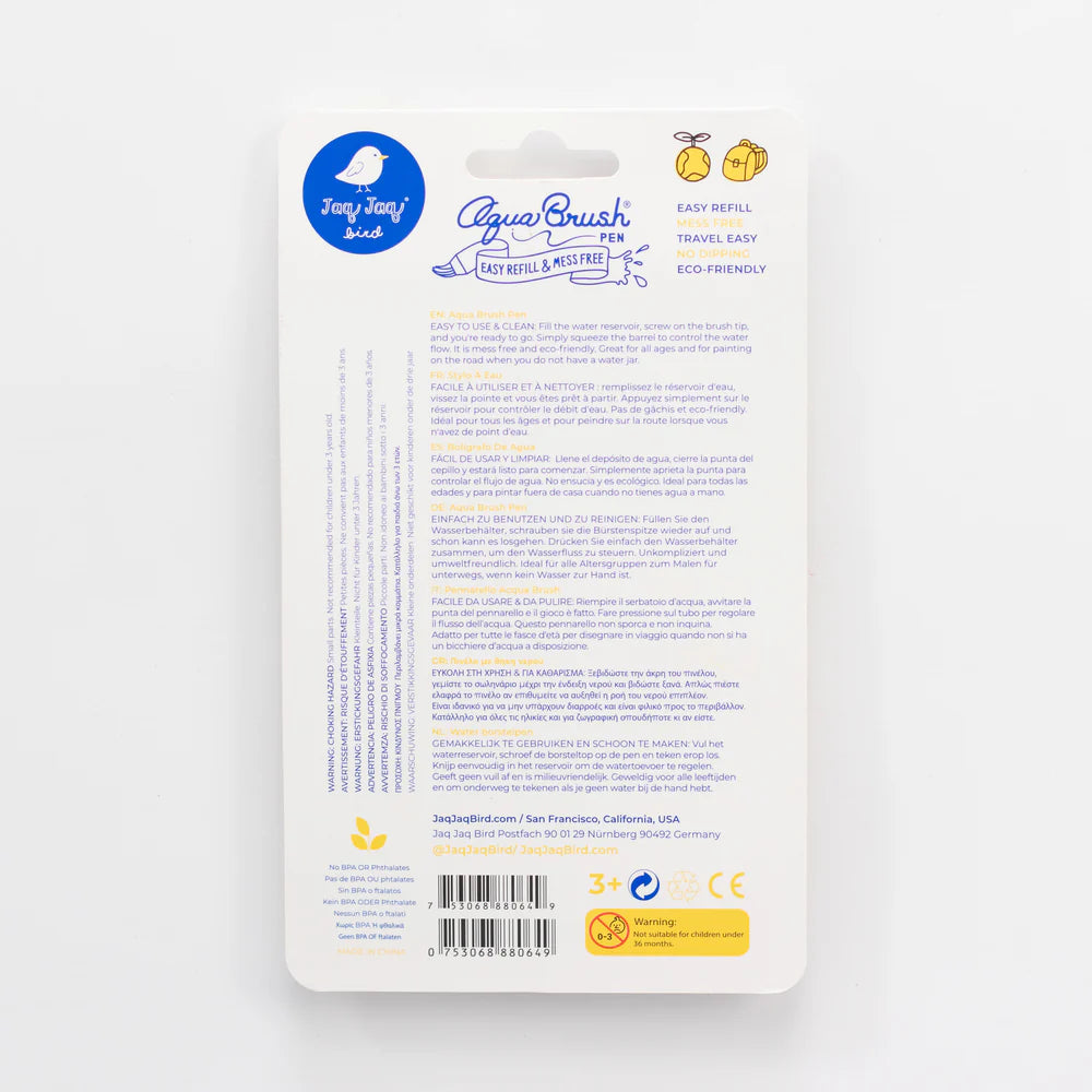 Good things come in threes! Jaq Jaq Bird’s Watercolor Brushes Portable and Travel Friendly set includes three Aqua Brush Pens in small, medium, and large tip sizes—perfect for turning ButterStix® drawings into vibrant watercolor masterpieces. With durable brush tips for precise control and a soft, easy-to-squeeze barrel, these brushes are simple for little hands and adults alike. Compact and designed for spontaneous creativity, they’re a must-have accessory for travel, gifts, and everyday art adventures.